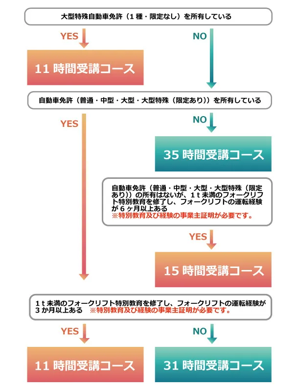 必要となる講習時間は取得免許の状況や1トン未満のフォークリフトの特別講習の有無などによって35時間から11時間まであるみたいです